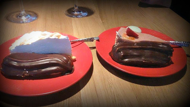 | Avokaado-kanasalat ja sõbranna tellis sibulasupi Magustoiduks valisin mina võrratute kookide seast välja sidruni-taralette ja ekleeri. Sõbranna proovis maasika-mango kooki. |